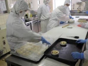 惣菜パン・菓子パン・焼き菓子等、計量から成型まで工程を細かく分けて、皆が協力しながら1つの製品をつくりあげています。